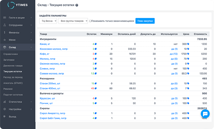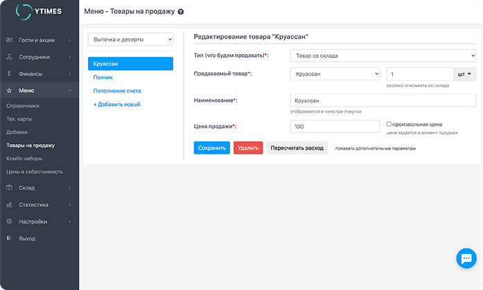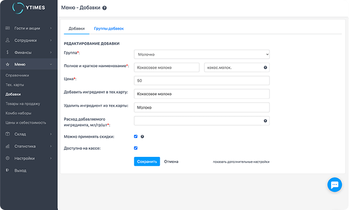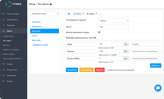 Настройка техкарт на блюда и напитки. Прописываете состав, какие ингредиенты и в каком количестве расходовать со склада